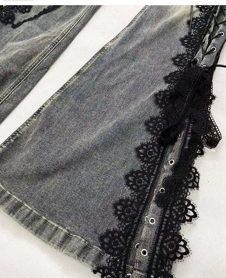 病みかわいい サイドレースアップフレアデニムパンツ 春服 ユニセックス メンズ パーカー カジュアル おしゃれ 原宿系ゴスロリ系ファッション 地雷系 おしゃれ y2kファッション 地雷系ファッション ゴスロリファッション yk25030701 | 病みかわいい