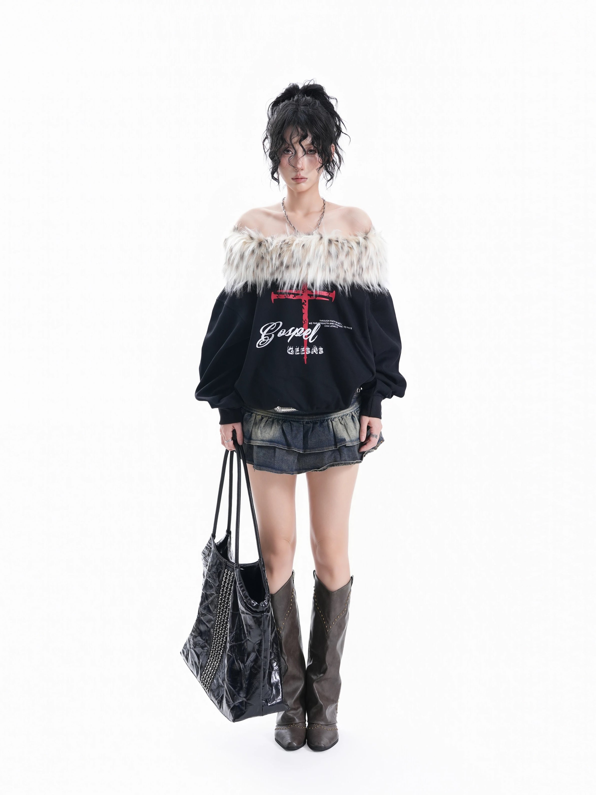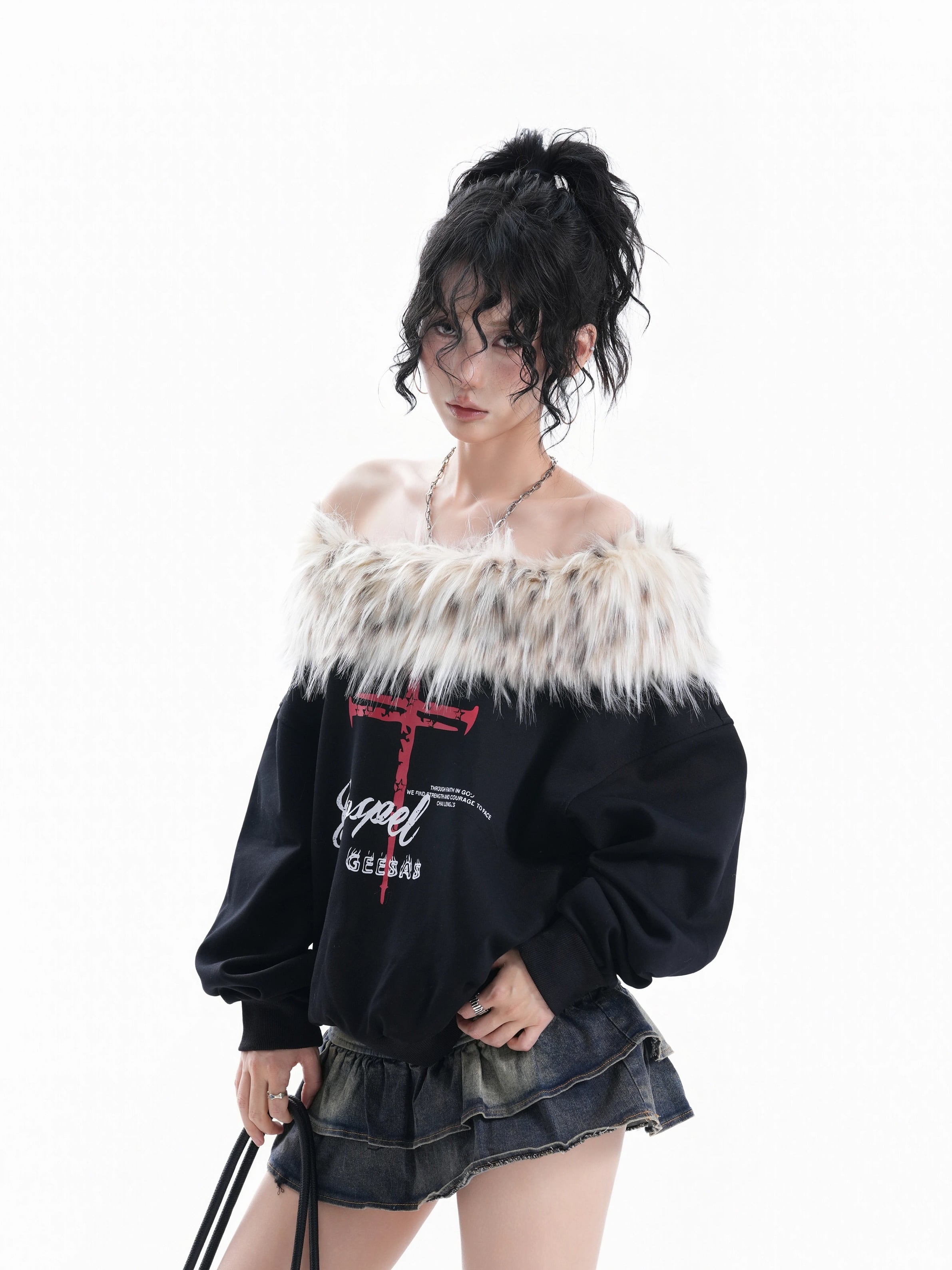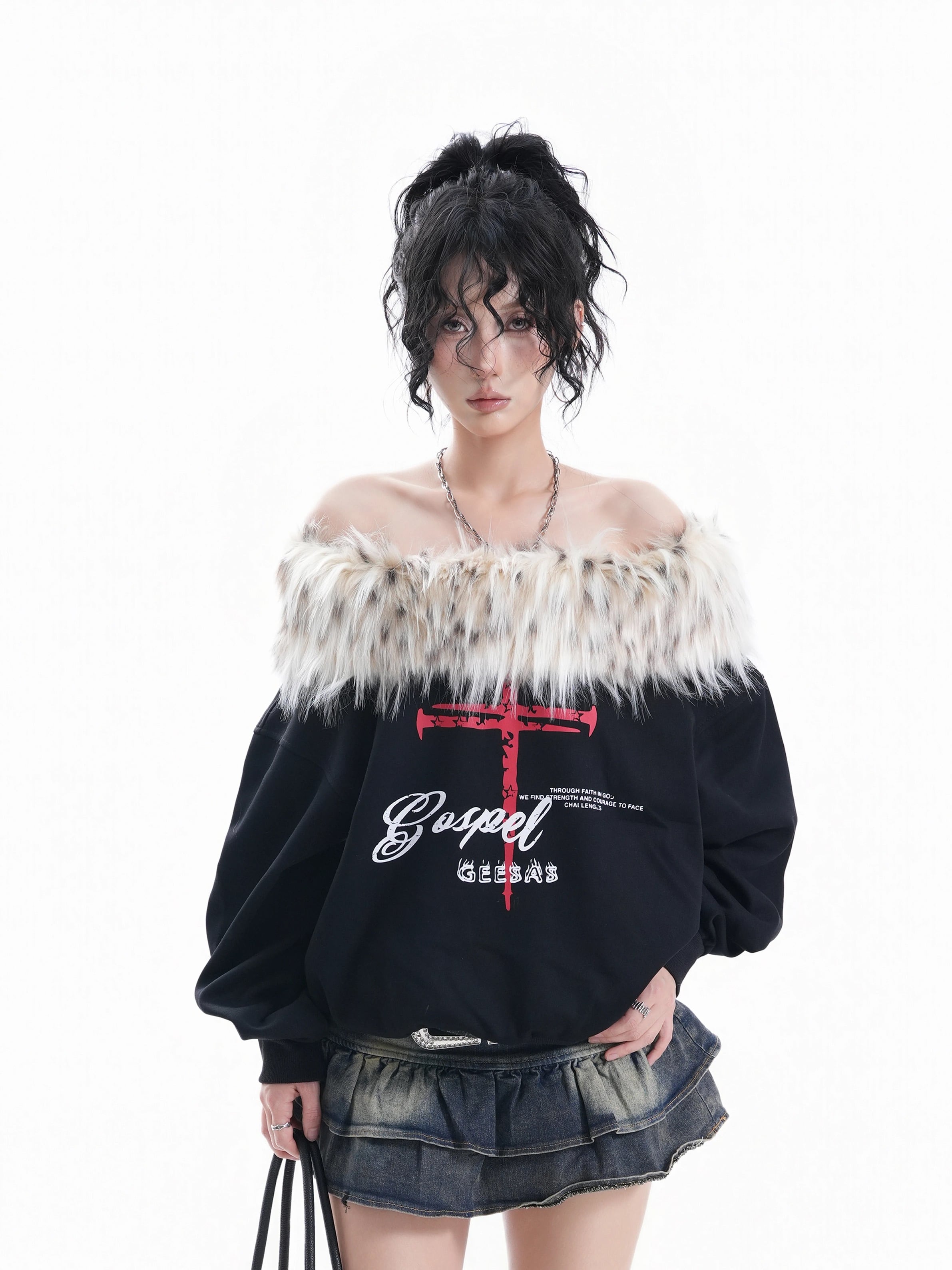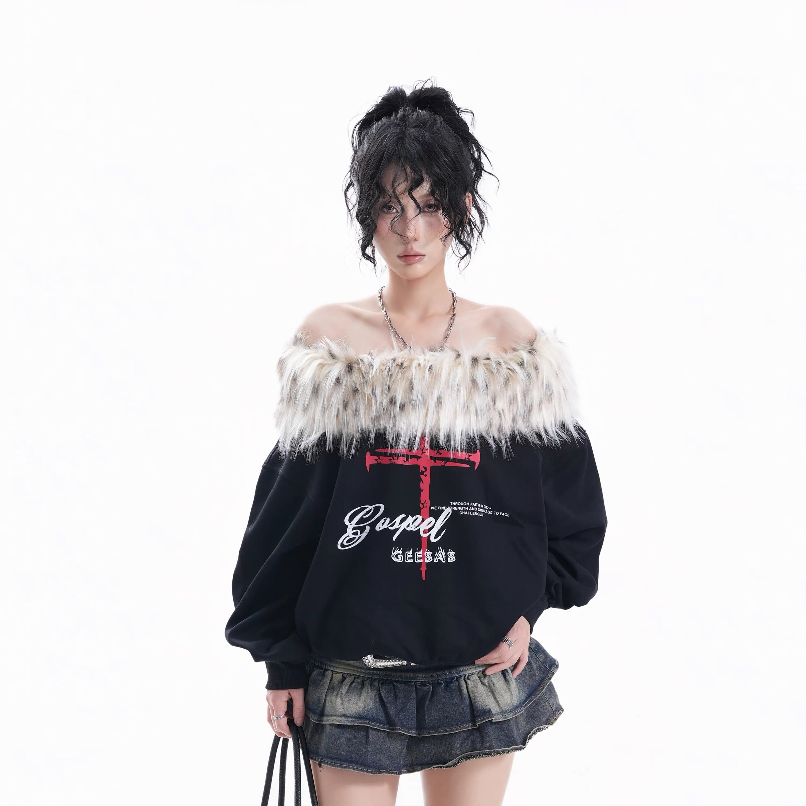 病みかわいい ファー付き十字架オフショルトレーナー カジュアル おしゃれ 原宿系ゴスロリ系ファッション 地雷系 おしゃれ y2kファッション 地雷系ファッション ゴスロリファッション yk25101201 | 病みかわいい