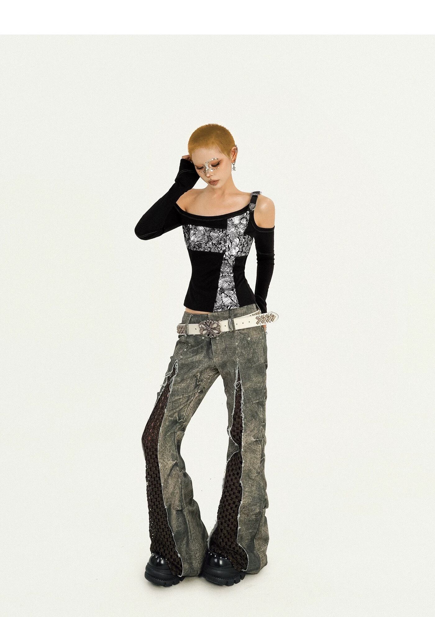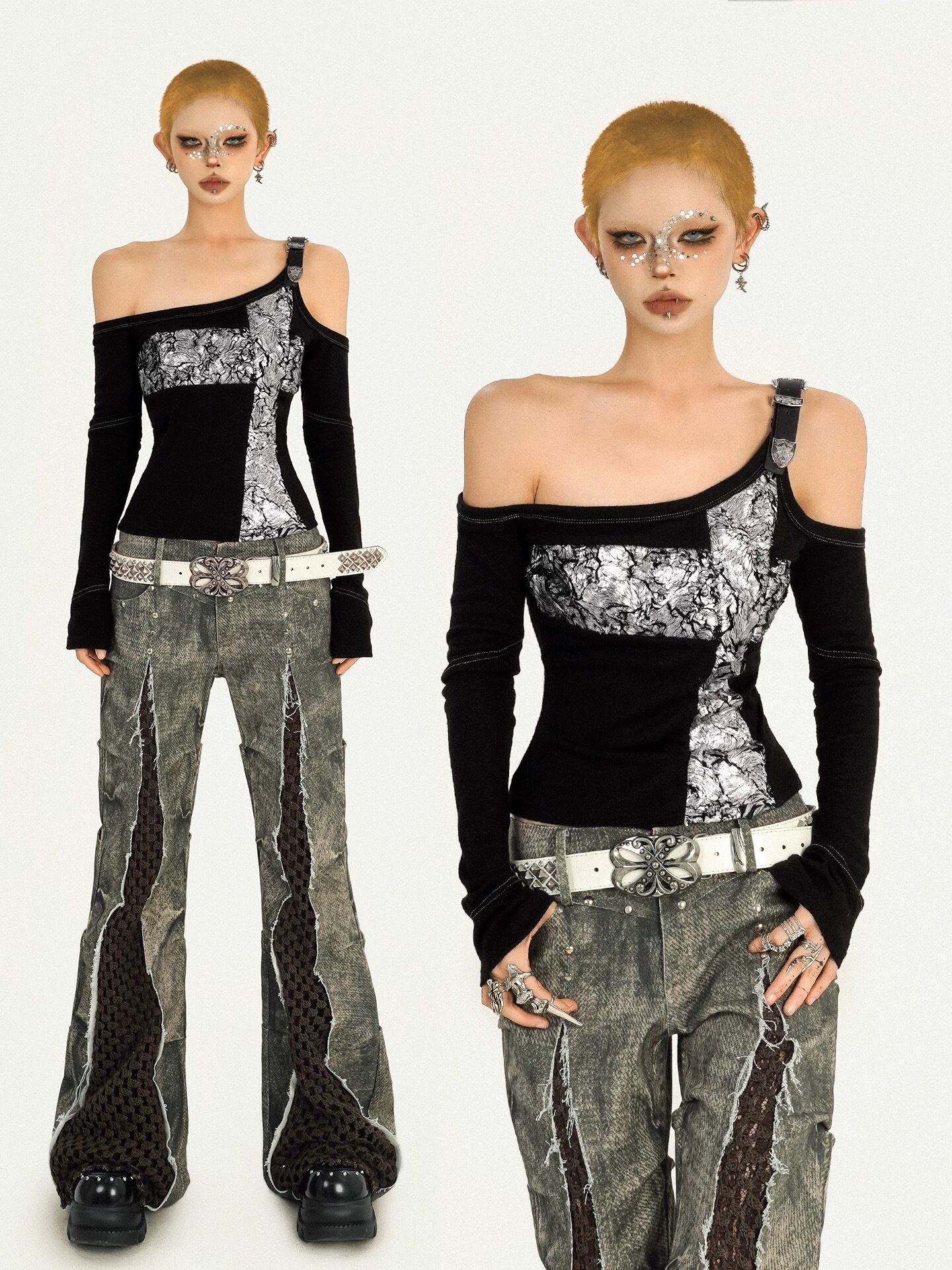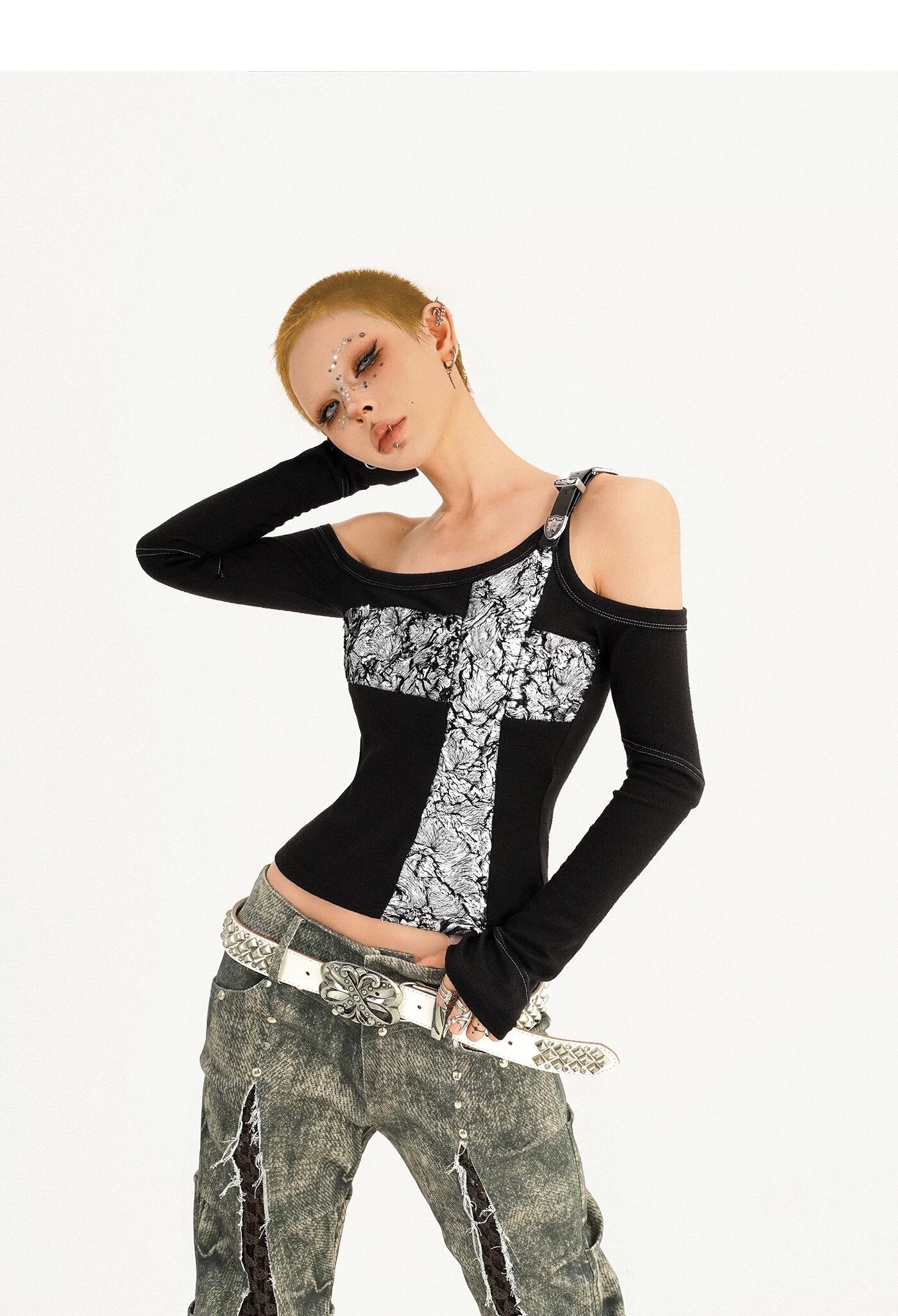 病みかわいい オフショルダー十字架トップス 地雷系 カジュアル おしゃれ 原宿系ゴスロリ系ファッション 地雷系 おしゃれ y2kファッション 地雷系ファッション ゴスロリファッション yk25120401 | 病みかわいい